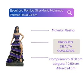 A Escultura Pomba Gira Maria Mulambo Preta e Roxa, da Bialluz é uma estatueta repleta de detalhes bem feitos e um ótimo item decorativo. Confeccionado em resina garante alta resistência e durabilidade. Possui uma pintura realizada artesanalmente com um brilho incomparável e cores vibrantes.