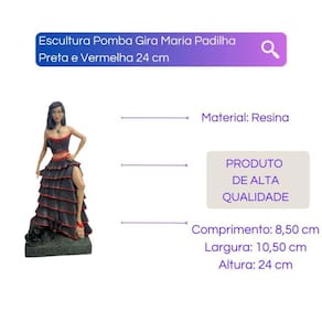 A Escultura Pomba Gira Maria Padilha Preta e Vermelha, da Bialluz é uma estatueta repleta de detalhes bem feitos e um ótimo item decorativo. Confeccionado em resina garante alta resistência e durabilidade. Possui uma pintura realizada artesanalmente com um brilho incomparável e cores vibrantes.