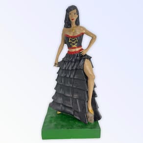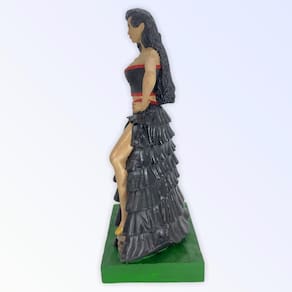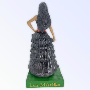 Escultura Pomba gira preta 24 cm com crânio no pé 7 saias em resina