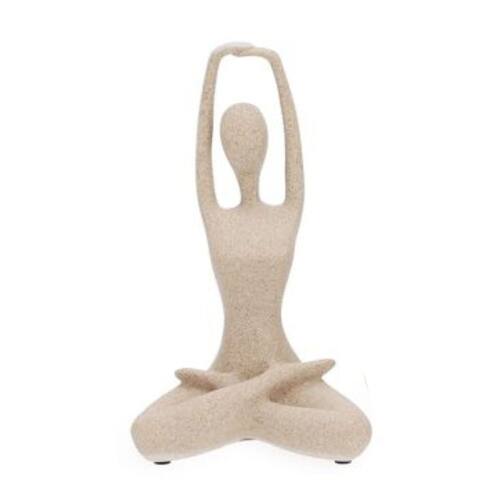 A estatueta está em uma postura de meditação, sentada com as pernas cruzadas, e os braços estão levantados para o alto, com as mãos unidas acima da cabeça. A pose sugere concentração e alongamento, uma postura comum de Saudação ao Sol. Especificações: Altura: 24cm Largura: 14,5cm Profundidade: 10,5cm Material: Poliresina Conteúdo Da Embalagem: 1 Escultura