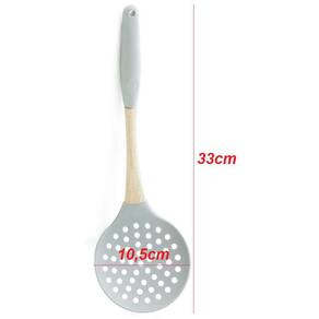 - Fabricada em Silicone - Cabo em Madeira e Silicone - Cabo possui furo para pendurar - Escumadeira possui 10,5cm diâmetro - Escumadeira é Flexível, maleável - Suporta temperaturas entre -40C a +240C