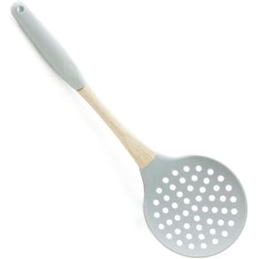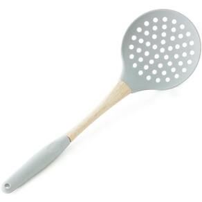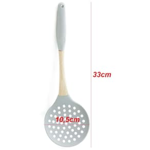 - Fabricada em Silicone - Cabo em Madeira e Silicone - Cabo possui furo para pendurar - Escumadeira possui 10,5cm diâmetro - Escumadeira é Flexível, maleável - Suporta temperaturas entre -40C a +240C