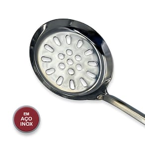 Utensílio culinário escumadeira para fritura, produto inteiriço em Aço inox, sem emendas, facilitando sua higienização e utilização. Formato tipo concha com furinhos para passar a gordura e deixar seu alimento mais sequinho.