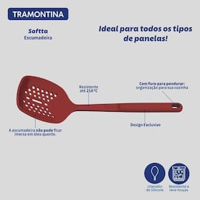 Preparar alimentos com mais cuidado e leveza fica mais fácil com a escumadeira Tramontina Softta em silicone vermelho. Resistente a até 210 C, ela é perfeita para lidar com alimentos quentes sem comprometer panelas com revestimento antiaderente. O silicone evita riscos, enquanto o cabo anatômico garante conforto no uso. A tonalidade vibrante adiciona personalidade à cozinha, e a limpeza é simples: pode ir direto à lava-louça. Um utensílio que alia praticidade no preparo ao cuidado com cada detalhe da sua rotina.