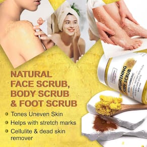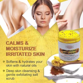 A cúrcuma é conhecida por trazer um brilho natural ao corpo, iluminar manchas escuras e combater o envelhecimento da pele. Sua pele ficará muito macia e revigorada depois de usar este esfoliante! Diga adeus à pele seca e opaca e olá ao seu brilho natural 🌸 Use na parte interna das coxas, joelhos e axilas, na área do biquíni e nos cotovelos. Não use antes ou depois do barbear ou depilação. Se ocorrer irritação, interrompa a esfoliação e remova a pele seca e escamosa com este esfoliante corporal revigorante. Feito com açafrão e óleo de amêndoa nutritivo. ?? pele opaca ?? pele radiante ?? Tom de pele irregular ?? Vegano ?? Manchas escuras ?? Manchas de acne A cúrcuma é o tempero mais comumente utilizado na culinária indiana. Mas seus benefícios incríveis vão além da cozinha. utilizado por séculos em regimes de cuidados com a pele na tradição ayurveda. Use topicamente para obter um brilho natural mais saudável e polir a pele seca. Este esfoliante esfoliará e deixará sua pele refrescada e hidratada. Como usar: Massageie na pele em movimentos circulares e enxágue. Tenha cuidado. A banheira pode estar escorregadia.