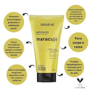 O Esfoliante Rosto e Corpo Maracujá é um produto desenvolvido para promover uma limpeza profunda e esfoliação suave da pele do rosto e do corpo. Possui microesferas naturais que ajudam a remover as células mortas da pele ativando a circulação sanguínea, deixando-a mais lisa, macia e uniforme.