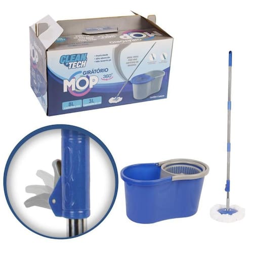 Esfregão Giratório com Balde 8L e Cabo Ajustável Especificações: Dimensões do balde: 20 cm altura x 39 cm comprimento Esfregão: comprimento máximo 130 cm Material: Polipropileno PP , aço inox e microfibra Capacidade: 8 litros total / 3 litros uso Cor: Cinza e azul enviado , conforme Para que serve / Funcionalidades: O Mop Giratório 360º é ideal para agilizar e facilitar a limpeza de pisos no dia a dia. Com o sistema de rotação 360 graus, alcança cantos e áreas de difícil acesso, proporcionando uma higienização completa sem esforço. O balde possui compartimento duplo, sendo um para água e sabão, e outro com cesto centrífugo que torce o mop facilmente, evitando contato direto com a sujeira. A haste de aço inox é leve, ajustável e resistente, oferecendo conforto no manuseio. Compatível com refis de microfibra laváveis, indicado para diferentes tipos de pisos: cerâmica, porcelanato, madeira, laminado e até superfícies mais delicadas. Descrição: Prático, higiênico e durável, o Mop Giratório 360º com balde duplo é a solução completa para quem busca eficiência e economia de tempo na limpeza. O sistema de centrifugação mantém as mãos limpas, enquanto a base giratória alcança facilmente todos os cantos. Fácil de montar, usar e guardar, sendo perfeito tanto para uso doméstico quanto . O que contém: 01 Balde duplo com compartimento centrífugo 01 Cesta giratória 01 Cabo extensor ajustável em aço inox 01 Refil de microfibra Marca: Não Informado