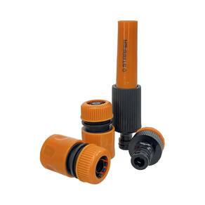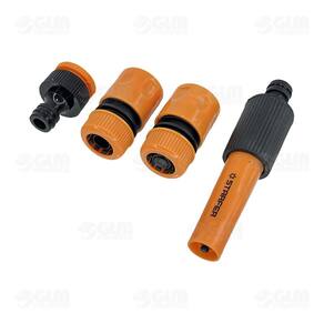 - Possui 4 peças - Para uso em mangueiras de 1/2'' - Possui sistema de regulagem do fluxo d''água - Conjunto de esguicho e conexões para mangueira - Indicado para ligar mangueira 1/2 para sistema de irrigação - Ideal para regar jardins, lavar carros ou até mesmo para limpeza de áreas externas