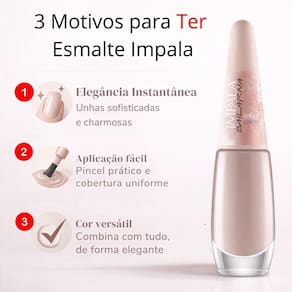 O Esmalte Cremoso Impala Bailarina Collant é versátil e perfeito para diversas ocasiões. Ideal para o uso diário, adicionando um toque de elegância discreta ao seu visual de trabalho ou lazer. Também é excelente para eventos especiais, festas e celebrações, onde você deseja que suas unhas complementem um look sofisticado e charmoso. Perfeito para quem ama a estética clássica e romântica, e busca um esmalte que combine com qualquer roupa e acessório. Use-o em casamentos, formaturas, jantares e encontros importantes.