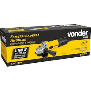 Marca: vonderconteúdo da embalagem:1 esmerilhadeira angular. Acompanha: 1 capa de proteção com trava de ajuste rápido, 1 punho auxiliar antivibratório e 1 chave 2 pinos.Destaques e diferenciais:possui punho auxiliar com sistema antivibração, proporcionando maior conforto na operação, além de duas posições de fixação, que atuam como apoio durante o manuseio da ferramenta, adaptando-se a diferentes situações e locais de uso, muitas vezes de difícil acesso. Conta ainda com botão de trava do eixo, interruptor com trava de segurança e empunhadura ergonômica, que confere maior conforto no manuseio, além de dupla isolação, garantindo maior segurança ao operador.Aplicações e dicas de uso:uso industrial. Indicada para corte, desbaste e acabamento em superfícies metálicas.Detalhes técnicosmodelo: eav 1105 potência: 1.100 w capacidade da esmerilhadeira disco : 5 - 125 mm rosca do eixo: m 14 tipo de velocidade: fixa rotação rpm : 11.000/min ajuste do cabo da esmerilhadeira: fixo número de posições de ajuste do punho: 2 posições segue norma: abnt nbr iec 60745-1 e abnt nbr iec 60745-2-3 tensão v : 127 v frequência hz : 50 hz/60 hz aceleração transmitida nas mãos - braços do operador - ah: 6,134 m/s incerteza da aceleração transmitida nas mãos - braços do operador - k: 1,5 m/s massa aproximada peso kg : 2,2 kg recomendações de segurança avisos/alertas : utilizar equipamentos de proteção individual, como óculos de proteção, protetor auditivo, respirador para particulados, luvas e avental de raspa. Sempre fazer uma vistoria prévia da ferramenta para detectar possíveis fios desencapados ou alguma irregularidade. Garantia - e cdc :garantia legal: 90 dias + garantia contratual: 9 meses para locadoras, garantia única e exclusiva de 90 dias
