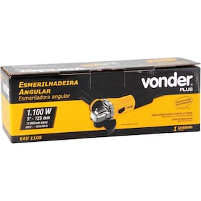 Marca: vonderconteúdo da embalagem:1 esmerilhadeira angular. Acompanha: 1 capa de proteção com trava de ajuste rápido, 1 punho auxiliar antivibratório e 1 chave 2 pinos.Destaques e diferenciais:possui punho auxiliar com sistema antivibração, proporcionando maior conforto na operação, além de duas posições de fixação, que atuam como apoio durante o manuseio da ferramenta, adaptando-se a diferentes situações e locais de uso, muitas vezes de difícil acesso. Conta ainda com botão de trava do eixo, interruptor com trava de segurança e empunhadura ergonômica, que confere maior conforto no manuseio, além de dupla isolação, garantindo maior segurança ao operador.Aplicações e dicas de uso:uso industrial. Indicada para corte, desbaste e acabamento em superfícies metálicas.Detalhes técnicosmodelo: eav 1105 potência: 1.100 w capacidade da esmerilhadeira disco : 5 - 125 mm rosca do eixo: m 14 tipo de velocidade: fixa rotação rpm : 11.000/min ajuste do cabo da esmerilhadeira: fixo número de posições de ajuste do punho: 2 posições segue norma: abnt nbr iec 60745-1 e abnt nbr iec 60745-2-3 tensão v : 220 v frequência hz : 50 hz/60 hz aceleração transmitida nas mãos - braços do operador - ah: 6,134 m/s incerteza da aceleração transmitida nas mãos - braços do operador - k: 1,5 m/s massa aproximada peso kg : 2,2 kg recomendações de segurança avisos/alertas : utilizar equipamentos de proteção individual, como óculos de proteção, protetor auditivo, respirador para particulados, luvas e avental de raspa. Sempre fazer uma vistoria prévia da ferramenta para detectar possíveis fios desencapados ou alguma irregularidade. Garantia - e cdc :garantia legal: 90 dias + garantia contratual: 9 meses para locadoras, garantia única e exclusiva de 90 dias