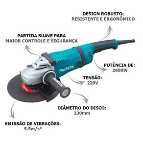 Descrição: A Esmerilhadeira Makita GA9040S é a escolha perfeita para profissionais que buscam potência e eficiência. Com 2600W de potência e disco de 9 polegadas, este equipamento proporciona cortes e desbastes precisos, mesmo nos materiais mais resistentes. Sua tecnologia Soft Start garante partida suave, oferecendo maior segurança e controle durante o uso.
