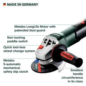 Metabo Rebarbadora de 4 1/5.1 - 12.7 cm, motor de 11 AMP, ferramenta de trituração de 11.000 RPM, cortador de metal compacto feito na Alemanha, moedor elétrico, troca rápida, interruptor de pá sem - Moedor angular feito na Alemanha: projetado para durabilidade, segurança e produtividade, o cortador de metal Metabo oferece desempenho excepcional, tornando-o um moedor elétrico versátil e confiável para moagem de metal exigente e corte de alvenaria. - Motor de vida útil mais longa de 11 AMP: o motor Metabo LongLife garante até 50% mais torque, 20% maior capacidade de sobrecarga e proteção patenteada contra poeira. Velocidade sem carga de 11.000 RPM em um design compacto com a menor circunferência da alça em sua classe para ergonomia perfeita. - SEGURANÇA E CONFORTO: um interruptor de pá sem travamento garante maior segurança e conforto do usuário. O interruptor de pá com função de homem morto torna esta ferramenta moedor segura para operar. - PRODUTIVIDADE MAXIMIZADA: A embreagem limitadora de torque automática Metabo Grinder S reduz a chance de retrocesso no caso de um engarrafamento acessório. A caixa de engrenagem pode ser montada girada em passos de 90° para operação com a mão esquerda ou corte. - Moedor elétrico potente e compacto: esta rebarbadora Metabo de 10 a 12 cm proporciona durabilidade robusta e uma construção compacta com torque de 71 cm, tornando-a a ferramenta de corte perfeita para tarefas exigentes. - O poder de atender aos seus padrões: Metabo é líder em ferramentas elétricas portáteis de nível profissional. Feito com engenharia alemã meticulosa, os moedores Metabo são confiáveis por profissionais em todo o mundo. Descubra mais na Metabo Brand Store.