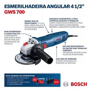 Produto EsmerilhadeiraTipo AngularModelo GWS 700Marca BoschUso Indicado Corte, desbaste, lixamento, acabamento, remoção de material em metaisDiâmetro do Disco em Milímetro 115,00 mmDiâmetro do Disco em Polegadas 4.5 "Alimentação ElétricaTensão Elétrica 127V (110V)Potência 700 WFerramenta Intercambiável NãoAcompanha Disco NãoPeso do Produto 1,70 KgProduto Acompanha Embalagem SimTipo de Embalagem CaixaAltura da Embalagem 11,00 mmLargura da Embalagem 12,00 mmProfundidade da Embalagem 28,00 mmPeso do Produto na Embalagem 2,20 KgConteúdo da Embalagem 1 Esmerilhadeira GWS 700, 1 chave de aperto, 1 flange de apoio, 1 porca de aperto, 1 capa de proteção, 1 punho auxiliar e 1 manualDimensão da Embalagem 11x12x28 cm mmEixo M14