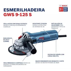 Vantagens da Esmerilhadeira Angular 5" 900W GWS9-125 S 127V BoschA Esmerilhadeira Angular Bosch GWS 9-125 S possui 900 Watts de potência, e é uma solução para realização de cortes e desbastes em materiais metálicos, como ferro e aço. Também pode ser utilizada para corte em alvenaria e concreto. (Note que para cada tipo de aplicação existe um acessório correto - discos abrasivos ou discos diamantados). Esta máquina conta com capa de proteção de 5"" / 125 milímetros com sistema de fixação por meio de parafuso, que garante que a capa não se desloque em caso de rompimento do disco, dando mais segurança ao operador da ferramenta.Conta também com empunhadeira auxiliar e corpo mais delgado em forma redonda. Essas características geram praticidade e trabalhos menos cansativos ao usuário. Além disso, esta esmerilhadeira disponibiliza seletor de velocidades (6 níveis - 2800 a 11000 rpm) para trabalhos em diferentes aplicações e tipos de acessórios, (tais como lixamentos ou aplicações em aço inoxidável). Por ser compacta facilita aplicações em locais de menor tamanho e de difícil acesso. A Esmerilhadeira GWS 9-125 S é indicada para uso industrial. Trabalho intenso.CompactaIdeal para utilização em locais de difícil acesso.VersátilA máquina mais leve da categoria com melhor ergonomia para o usuário e versátilidade de uso atravéz do seletor de velocidade variável. Corte, desbaste, lixamento, acabamento, remoção de material em metais e concreto. 1,7Kg motor slim de 900W, carcaça de engrenagens compacta e velocidade variável.Motor com 900 Watts de potência. Capa de proteção de 5" / 125 mm - com sistema de fixação por parafuso (robustez).Carcaça de engrenagens em alumínio, extremamente robusta.Uso industrial com 2 anos de garantia.AcompanhaEsse Kit traz: 1 Chave de aperto 1 porca de apoio 1 porca de aperto 1 Capa protetora 1 punho auxiliar.