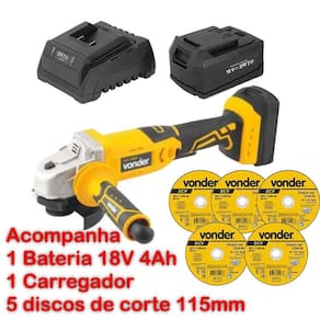 Conteúdo da Embalagem: 1 Esmerilhadeira 4.1/2 IEV 1808 Vonder + 1 Carregador de bateria DWT + 1 Bateria 18V 4Ah DWT + 5 Discos de corte 115,0 mm x 1,0 mm x 22,23 mm, DCV, VONDER - Esmerilhadeira 4.1/2 IEV 1808 Vonder legal: 90 dias + contratual: 9 meses Para locadoras, única e exclusiva de 90 dias 1 Esmerilhadeira, acompanha: 1 punho auxiliar, 1 chave e 1 capa de proteção do disco. Este equipamento utiliza um modelo de bateria que pode ser intercambiável não acompanha , ou seja, uma bateria que é compatível com outros modelos de ferramentas a bateria VONDER. Por isso, em sua próxima compra de ferramenta a bateria VONDER, procure um modelo que comece com a referência I, ou que esteja identificado com o selo Bateria Intercambiável VONDER. Desta forma, você garante modelos mais econômicos, sem a necessidade de aquisição de novas baterias e carregadores para uso em seu equipamento. Possui punho auxiliar com duas posições de fixação que atua como apoio durante o manuseio da ferramenta, adaptando-se a diferentes situações e locais de uso, muitas vezes de difícil acesso. Com estrutura compacta, conta com botão de trava do eixo e dupla isolação, garantindo maior segurança ao operador. Indicada para corte, desbaste e acabamento em superfícies metálicas. DETALHES TÉCNICOS Modelo: IEV 1808 Bateria: Capacidade da esmerilhadeira disco : 4.1/2 - 115 mm Rosca do eixo: M 14 Tipo de velocidade: Fixa Rotações por minuto rpm : 8.500/min Número de posições de ajuste do punho: 2 posições Ajuste do cabo da esmerilhadeira: Fixo Tensão do carregador de bateria: Não acompanha Aceleração transmitida nas mãos - braços do operador - ah: 9,06 m/s Incerteza da aceleração transmitida nas mãos - braços do operador - k: 1,5 m/s Massa aproximada peso : 1,74 kg Acessórios/peças que acompanham o produto: Acompanha: 1 punho auxiliar, 1 chave e 1 capa de proteção do disco - Bateria 18,0 V, íons de lítio, linha intercambiável, 4,0 Ah, IBD 1804 DWT Conteúdo da Embalagem: legal: 90 dias + contratual: 9 meses 1 Bateria. Indicada para a linha de ferramentas a bateria intercambiável VONDER / DWT. Carregadores indicados: carregador de bateria 18 V ICBV 1805 60.04.180.500 , carregador de bateria carga rápida 18 V ICBV 1806 60.04.180.600 ou carregador de bateria para automóveis 12 V 60.04.184.300 . Modelo: ibd 1804 Tipo de bateria: Íons de lítio Tensão V : 18,0 V Capacidade da bateria A : 4,0 Ah Indicador de bateria fraca: Sim Massa aproximada peso : 0,5 kg Fluxo de aplicação de cola: 15 g/min Tempo de aquecimento: 3 minutos Tensão do carregador de bateria: - Disco de corte 115,0 mm x 1,0 mm x 22,23 mm, DCV, VONDER Conteúdo da Embalagem: 1 Disco de corte. Proporciona cortes rápidos e menor geração de calor e rebarbas.Indicado para cortar aços e suas ligas, inclusive aço inox. Ideal para operações de corte que necessitam excelente acabamento corte fino . Não utilizar em serra mármore. legal: 90 dias Modelo: dcv Diâmetro do disco de corte: 115 mm Espessura: 1,0 mm +/-3/64 Tipo de disco: Tipo 41 Diâmetro do furo: 22,23 mm 7/8 Grão: g 60 Número de telas do disco: 2 Rotação máxima do disco rpm : 13.300/min Segue norma s : ABNT NBR 15230 e ABNT NBR 16245