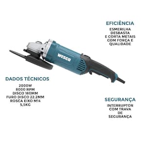 Esmerilhadeira angular com 180 mm e 2.000 w da wesco, modelo ws4721 Este é o lançamento da wesco, a superesmerilhadeira ws4721 com 2000w e pronta para o trabalho de alta performance. Ela é robusta e possui uma carcaça resistente, que possibilita a sua ação em locais que exigem força e qualidade. Diferenciais da ws4721 Possui caixa de engrenagens em alumínio; Conta com empunhadura principal giratória para melhor posicionamento de uso; Possui capa de proteção com ajuste sem chaves; Vem com empunhadura auxiliar com 3 posições; Conta com o sistema de trava de eixo para a troca do disco; Para a sua segurança, a ws4721 é equipada com com trava de segurança e liga/desliga lateral. Dados técnicos: Tensão nominal: 50/60hz; Potência nominal: 2000 w; Velocidade nominal: 8000 /min; Tamanho do risco: 180mm; Furo dos discos: 22.2mm; Rosca do eixo: m14; Duplo isolamento: sim; Peso: 5.5kg. Itens que acompanham a máquina: -01 capa de proteção com ajuste rápido; -01 empunhadura auxiliar; -01 chave para troca do disco; -01 chave allen. Marca: Não Informado Ean: 7909463124274