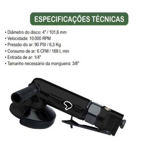 Esmerilhadeira Lixadeira Angular Pneumática 4 Polegadas Tenha em mãos a esmerilhadeira angular pneumática PNW40EA, perfeita para serviços de remoção de rebarbas, respingos de solda, construção, montagem de estruturas metálicas, acabamentos e muito mais. Indicada para a indústria automotiva, oficinas mecânicas e outros segmentos, esta ferramenta oferece praticidade, desempenho e qualidade em uma só embalagem. O corpo em alumínio garante fácil manuseio e operação com apenas uma mão, além de proporcionar maior durabilidade e resistência. Com exaustor traseiro, a esmerilhadeira mantém o ambiente de trabalho mais limpo e seguro. Com tamanho compacto, ela oferece praticidade e mobilidade para realizar diversos tipos de trabalhos. Com um disco de 4 101,6mm de diâmetro e velocidade livre de 10.000 RPM, esta ferramenta garante eficiência e agilidade em qualquer serviço. Além disso, seu ângulo de trabalho de 90º proporciona maior precisão em trabalhos mais detalhados. Com um consumo de ar de 6 CFM 169 L/min e pressão do ar de 90 PSI 6.3 Kg/cm , ela garante o desempenho necessário para realizar trabalhos em uma variedade de materiais. A embalagem de apresentação é uma caixa de papelão micro ondulado impressa a 4 cores, garantindo proteção e qualidade durante o transporte. As dimensões da caixa são 26 x 14,5 x 10 cm, e o peso bruto é de 2,05 kg. A POTENTE BRASIL oferece uma de 6 meses a partir da data de compra, mediante apresentação da de compra. São 3 meses de legal e mais 3 meses de adicional concedida pela POTENTE BRASIL, contra defeitos de fabricação, exceto peças de desgaste. Especificações técnicas: Diâmetro do disco: 4 101,6 mm Velocidade livre: 10.000 RPM Ângulo de trabalho: 90º Consumo de ar: 6 CFM 169 L/min Pressão do ar: 90 PSI 6.3 Kg/cm Entrada de ar: 1/4 Comprimento: 228 mm Peso: 1,89 kg Adquira agora a sua esmerilhadeira angular pneumática PNW40EA e tenha a melhor solução para seus trabalhos de acabamento e remoção de rebarbas.