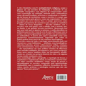 A obra Esotérica com S: multiplicidade religiosa, corpo e gênero em um terreiro de Umbanda é resultado de um trabalho etnográfico com objetivo de compreender como uma cosmologia tão múltipla, definida pelos umbandistas como afrouniversalista, atravessa a composição e a topologia de forças de territórios, como o terreiro e o corpo, que são polarizados pelo gênero, como um organizador ritual, e povoados por seres outros. Exu e o tempo aparecem como grandes promotores de encontros que cruzam os caminhos — linhas de força biográfica — dos/das médiuns com o terreiro, com seus guias, com a cidade, com o mundo, que, no limite, é um grande terreiro-território. Mostrando-nos que nem tudo que se ajunta se mistura, o estilo pluralista ou politeísta parece dar o tom da arte de unir a diferença sem se acabar com heterogeneidade nem perder seu pertencimento umbandista. A matriz afro aqui é entendida como uma perspectiva transformacional, sugerindo que todas as linhas podem fazer parte de um contínuo heterogêneo. O terreiro, antes de tudo, é um lugar naturalmente dado aos encontros, e seus habitantes — médiuns, exus/pombagiras, caboclos/caboclas, pretos velhos/pretas velhas, crianças, seres extraterrenos, seres intraterrenos, seres da natureza — são especialistas em uma política cósmica da diferença entre mundos múltiplos, divergentes e, por vezes, perigosos. Esses seres outros também estão em movimento, modificando-se, criando sua própria história de vida e, de alguma forma, sendo coetâneos a nós. Essa cosmologia afeta a geografia, a topologia de forças, a arquitetura e organização ritual, os conceitos e teorias nativas sobre corrente mediúnica, corpo, noção de pessoa e aprendizagem no terreiro, compondo uma epistemologia umbandista, que é complexa, reflexiva, formadora de conceitos, teoria, práticas e ontologias nativas que não são apenas “boas para pensar”.