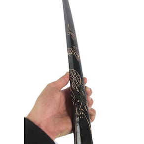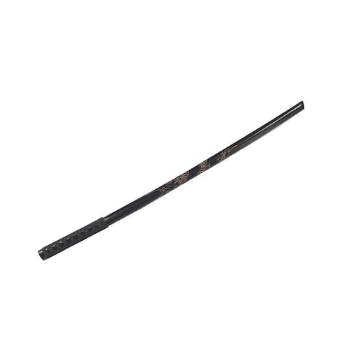 lâmina: 77,0 x 3,0 x 3,0 cm.-empunhadura: 24,0 x 4,0 x 3,0 cm.-comprimento total : 101,0 cm.Composição:-madeira, acordoamento em algodão, tinta pretaCaracterísticas:-espada indicada para treinamento de movimentos e ou impactos leves.-empunhadura acordoada.-desenhos em baixo relevoPeso: 0,465 gramas.