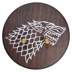 O cabo em ferro oferece uma pegada firme e estilizada, enquanto o pomo e a guarda em relevo adicionam detalhes que remetem à tradição da Casa Stark. Este modelo acompanha um suporte de parede em MDF, ideal para exibição, tornando-se uma peça de destaque em qualquer coleção.