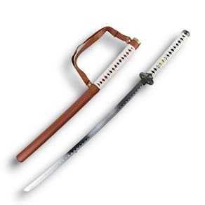 Esta linda katana e revestida de couro com detalhes em tecido branco lamina de aço sem corte.