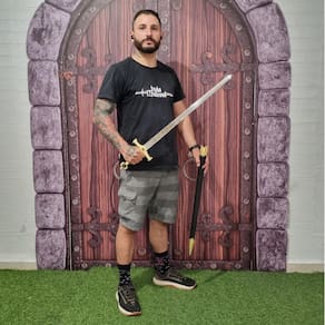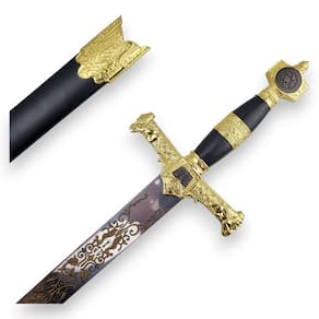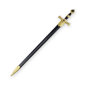 A Espada Rei Davi e Salomão Medieval Templária preta e dourada reflete essa história. A lâmina cromada com símbolos gravados evoca o poder divino, enquanto o cabo preto com detalhes dourados traz um toque de realeza e nobreza, ideal para exibição ou cerimônias.