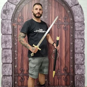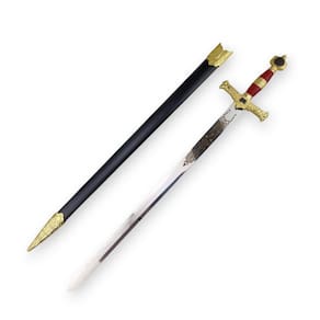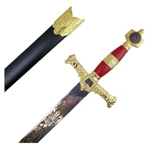 Cabo com acabamento em relevo e detalhes dourados Lâmina de aço cromado estampado Bainha de couro inclusa Símbolos templários e bíblicos por toda a peça Ideal para colecionadores e exibição decorativa Esta espada carrega em sua essência o simbolismo dos cavaleiros templários e dos grandes reis da BÃblia, fazendo dela uma peça indispensável para quem valoriza itens históricos e de grande valor cultural.