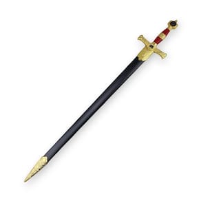 Comprimento Total : 86 cm Comprimento espada: 76 cm Lâmina : 57 cm espessura : 3 mm Cabo : 15 cm Material: Aço Peso : 854g Cor: Vermelho e Dourado com Detalhes dourados na Lâmina