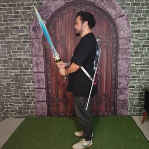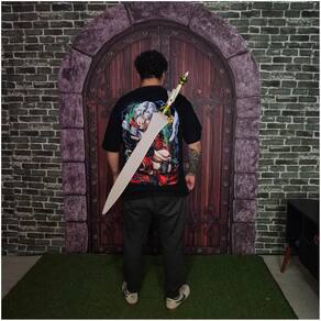 Comprimento total: 105 cm Comprimento da lâmina: 73 cm Espessura da lâmina: 2 mm Punho: 28 cm Peso da espada: 2.065 kg Material do suporte: Madeira Dimensões do suporte: 35,5 6,5 14,5 cm