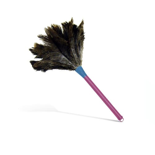 Tamanho: 35 cm. Composição: Plumas de Avestruz, cabo de madeira plastificado e aço.