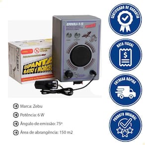 Espanta Rato E Morcego E 3 Unidade Remota Zebu Ermu 1/5 Turbo 10782-10790x3 - Proteja seu espaço de forma eficaz, prática e segura! - Este conjunto combina o espanta rato e morcego ERMU-1/5 Turbo com três unidades remotas UR-1079, ampliando a cobertura de até 450 m. - Com tecnologia ultrassônica confiável, você mantém sua casa, sítio ou empresa livre de roedores e morcegos sem contato químico. - Invista na tranquilidade e segurança que só a Zebu oferece! CONJUNTO COMPOSTO POR: 1 UN - ESPANTA RATO E MORCEGO ERMU-1/5 -1078 3 UN - UNIDADE REMOTA ESPANTA RATO E MORCEGO UR-1079