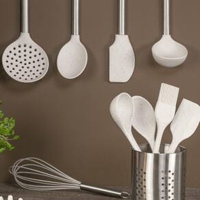 Lance a primeira pedra aquele que nunca riscou uma panela Por isso, somos fãs dos utensílios de silicone na hora de preparar os alimentos, pois deslizam suavemente pela panela, evitando arranhões. Além disso, você pode bater a haste para remover o excesso sem danificar a borda. O silicone facilita muito a limpeza, graças à sua superfície lisa que não retém odores, evita a proliferação de bactérias e não conduz o calor gerado pelo fogão. Marca: Não Informado