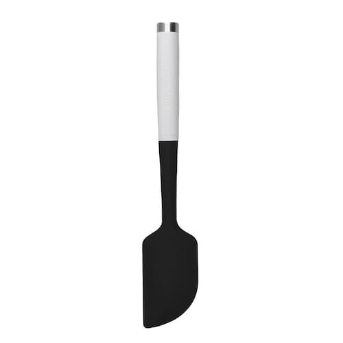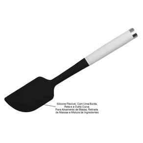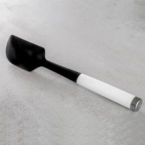 A espátula da KitchenAid possui a ponta principal feita de silicone flexível, com uma borda reta e a outra curva, e possui um cabo de plástico ergonômico.