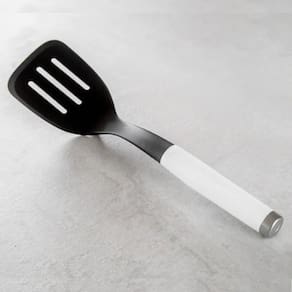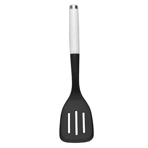 AEspátula Perfurada de Nylon Antiaderente da Kitchenaid contém furos no centro para diversos fins de cozimento, facilitando a drenagem de qualquer óleo ou água que tenha ficado no prato.