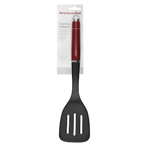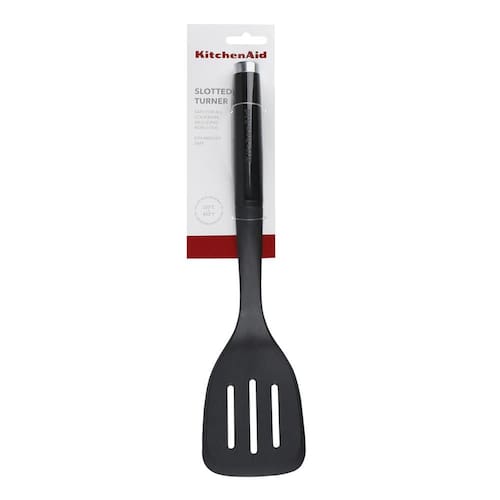 AEspátula Perfurada de Nylon Antiaderente da Kitchenaid contém furos no centro para diversos fins de cozimento, facilitando a drenagem de qualquer óleo ou água que tenha ficado no prato.