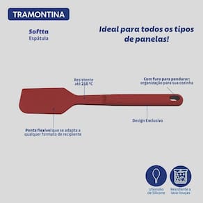 A espátula Tramontina Softta em silicone vermelho é uma aliada indispensável no preparo das refeições do dia a dia. Ideal para mexer, virar e servir alimentos sem danificar superfícies antiaderentes, ela suporta temperaturas de até 210 C, garantindo ao manusear ingredientes quentes. A ponta ível alcança facilmente os cantos das panelas e tigelas, otimizando o aproveitamento dos alimentos. O cabo anatômico oferece conforto durante o uso, enquanto a limpeza prática,inclusive na lava-louça, facilita sua rotina. Com um visual marcante e acabamento moderno, é o toque certo de funcionalidade e cor para sua cozinha.