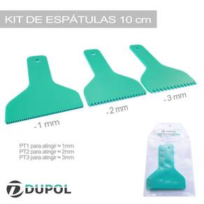 O Kit de espátulas possui 3 espátulas com 10 cm de comprimento para atingir as espessuras de ? de 1 mm, 2 mm e 3 mm.