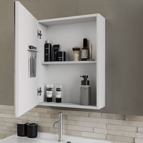 -Medida: 430 x 155 X 555mm -MDF 15MM Branco TX -Dobradiça com pistão com ângulo de abertura 110° -Porta Escova em PP -Espelho 3mm na porta -Fita Borda em PVC