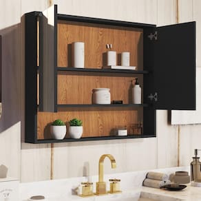Espelheira Eros Armário Aéreo Para Banheiro - Preto/Madeira Descrição