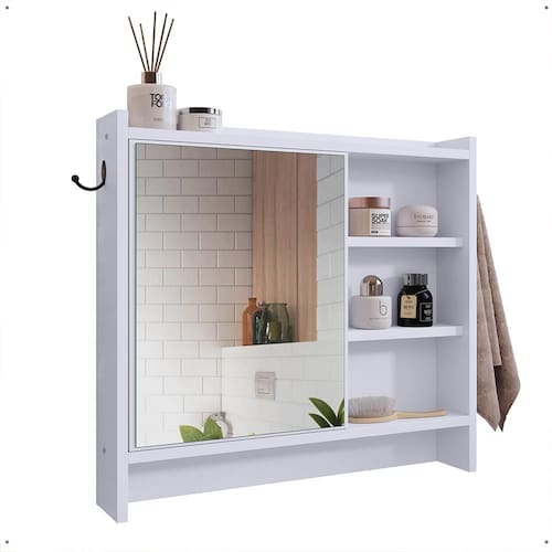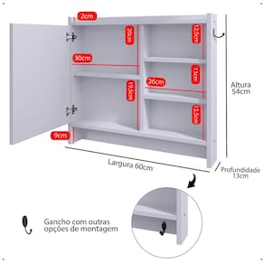 Ela conta com uma porta que permite armazenamento de itens de higiene pessoal de forma discreta e segura, protegendo-os da umidade e do acúmulo de poeira. Já os ganchos inferiores, são perfeitos para pendurar toalhas e pode ser instalado em qualquer local da espelheira.