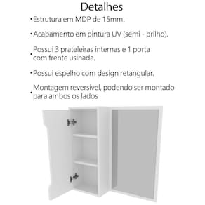 Espelheira Para Banheiro 60 cm 1 Porta BN3648, ideal para inovar o seu banheiro com toque luxuoso e ao mesmo tempo refinado. Estrutura em MDP de 15mm, proporcionando maior durabilidade e resistência a peça, contando com acabamento em pintura UV (semi - brilho). Composta por 1 porta com frente usinada e dobradiças metálicas, espelho com design retangular e 3 prateleiras internas para armazenar itens, prateleira suporta 3kg cada. Montagem reversível, podendo ser montado para ambos os lados. Perfeita para deixar seu ambiente produtivo, proporcionando uma ambientação elegante e moderna. Este móvel chegará na sua casa separado em 1 volume.