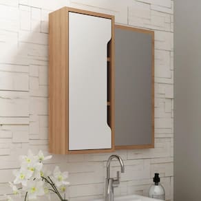 Características: Estrutura MDP Acabamento pintura UV 1 Porta 3 Prateleiras internas Podendo ser montado para ambos os lados Espelho de 560x309x3mm Suporta 3kg cada prateleira