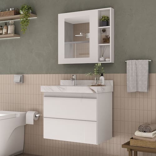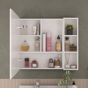 Espelho de 550 X 390 X 03 mm com acabamento lapidado, estruturado em porta de MDP BP (15mm). Possui prateleiras internas e porta com dobradiças slow, com sistema de amortecedor. Ao lado, acompanha Nicho de 20cm x 70cm, com prateleiras para maior organização. Acompanha tampa parafusos buchas de nylon parafusos para fixação na parede. Possui manual de instalação. Espelheira ideal para compor com os produtos da marca BUMI MÓVEIS, e os produtos da marca BLU LAVATÓRIOS (vide site do Madeira Madeira). Produto sai montado de fábrica, devidamente regulado, bastando apenas fixá-lo na parede. Garantia de 12 meses para defeito de fabricação. Acabamento da Porta: BP Acabamento da Prateleira: BP Altura do Espelho: 55 Ambiente Principal: Banheiro Composição: 70% MDP BP e 30% VIDRO Cor: Branco Cor do Produto: Branco Cor Interna: Branco Escala de Brilho: Acetinado Espessura do Espelho: 3 Formato do Espelho: Retangular Informações Complementares: Produto sai montado de fábrica, devidamente regulado, bastando apenas fixá-lo na parede. Itens Inclusos: 01 Espelheira Lisa 80cm Largura do Espelho: 39 Linha ou Coleção: Ripy Manual de Montagem e Instalação: https://product-hub-prd.madeiramadeira.com.br/906054/documents/c99cac5d-8f68-4823-bb40-565b928f4ade193257234861715173202101.pdf Material da Porta: MDF/MDP Material da Prateleira: MDF/MDP Material Principal: MDF/MDP Necessita Montagem: Não Origem do Produto: Nacional Peso: 13,85 kg Peso Máximo por Prateleira: 2 Possui Espelho: 01 Possui iluminação: Não Possui Portas: 01 Possui Prateleiras: 05 Possui Toalheiro: Não Possui Tomadas: Não Recomendações de Uso, Manutenção e Limpeza: Nunca utilizar produtos químicos. Use somente flanela levemente umedecida em água e em seguida uma outra seca e macia. Caso ocorra vazamento ou acúmulo de água no produto, enxugar imediatamente. Tipo de Dobradiça/Corrediça da Porta: Metálica Tipo de Fixação do Espelho: Parafusos Tipo de Porta: Bater Tipo de Puxador da Porta: Não Possui