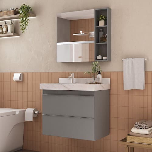 Espelho de 700 X 600 X 03 mm com acabamento lapidado, estruturado em porta de MDP BP (15mm). Possui prateleiras internas e porta com dobradiças slow, com sistema de amortecedor. Ao lado, acompanha Nicho de 20cm x 70cm, com prateleiras para maior organização. Acompanha tampa parafusos buchas de nylon parafusos para fixação na parede. Possui manual de instalação. Espelheira ideal para compor com os produtos da marca BUMI MÓVEIS, e os produtos da marca BLU LAVATÓRIOS (vide site do Madeira Madeira). Produto sai montado de fábrica, devidamente regulado, bastando apenas fixá-lo na parede. Garantia de 12 meses para defeito de fabricação. Acabamento da Porta: BP Acabamento da Prateleira: BP Altura do Espelho: 55 cm Ambiente Principal: Banheiro Composição: 70% MDP BP e 30% VIDRO Cor: Cinza Cor do Produto: Cinza Cor Interna: Cinza Escala de Brilho: Acetinado Espessura do Espelho: 3 mm Formato do Espelho: Retangular Informações Complementares: Produto sai montado de fábrica, devidamente regulado, bastando apenas fixá-lo na parede. Itens Inclusos: 01 Espelheira Lisa 80cm Largura do Espelho: 39 cm Linha ou Coleção: Ripy Manual de Montagem e Instalação: https://product-hub-prd.madeiramadeira.com.br/937275/documents/3df9fdef-1174-4834-a27c-e25d1d79c3d52275550348617249434438809.pdf Material da Porta: MDF/MDP Material da Prateleira: MDF/MDP Material Principal: MDF/MDP Necessita Montagem: Não Origem do Produto: Nacional Peso: 13,85 kg Peso Máximo por Prateleira: 2 kg Possui Espelho: 01 Possui iluminação: Não Possui Portas: 01 Possui Prateleiras: 05 Possui Toalheiro: Não Possui Tomadas: Não Recomendações de Uso, Manutenção e Limpeza: Nunca utilizar produtos químicos. Use somente flanela levemente umedecida em água e em seguida uma outra seca e macia. Caso ocorra vazamento ou acúmulo de água no produto, enxugar imediatamente. Tipo de Dobradiça/Corrediça da Porta: Metálica Tipo de Fixação do Espelho: Parafusos Tipo de Porta: Bater Tipo de Puxador da Porta: Não Possui
