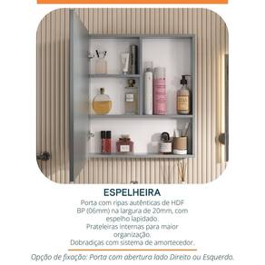 Espelho de 550 X 390 X 03 mm com acabamento lapidado, estruturado em porta com ripas autênticas de HDF BP (06mm). Possui prateleiras internas, para maior organização, e porta com dobradiças slow, com sistema de amortecedor. Acompanha tapa furos buchas de nylon parafusos para fixação na parede. Possui manual de instalação. Espelheira ideal para compor com os Armários e Gabinetes da marca BUMI MÓVEIS, e as Bancadas e Lavatórios da marca BLU LAVATÓRIOS (vide site do Madeira Madeira). Produto sai montado de fábrica, devidamente regulado, bastando apenas fixá-lo na parede. Garantia de 12 meses para defeito de fabricação. Acabamento da Porta: BP Acabamento da Prateleira: BP Altura do Espelho: 55 Ambiente Principal: Banheiro Composição: 70% de HDF BP e 30% de espelho Cor: Cinza Cor do Produto: Cinza Cor Interna: Cinza Escala de Brilho: Acetinado Espessura do Espelho: 3 Formato do Espelho: Retangular Informações Complementares: Produto sai montado de fábrica, devidamente regulado, bastando apenas fixá-lo na parede. Itens Inclusos: 01 Espelheira Ripy 60cm Largura do Espelho: 39 Linha ou Coleção: Ripy Manual de Montagem e Instalação: https://product-hub-prd.madeiramadeira.com.br/896593/documents/13759560-8b79-41f1-8d39-3837febb903f1931677espelheiraripy60.pdf Material da Porta: MDF/MDP Material da Prateleira: MDF/MDP Material Principal: MDF/MDP Necessita Montagem: Não Origem do Produto: Nacional Peso: 12 kg Peso Máximo por Prateleira: 2 Possui Espelho: 01 Possui iluminação: Não Possui Portas: 01 Possui Prateleiras: 02 Possui Toalheiro: Não Possui Tomadas: Não Recomendações de Uso, Manutenção e Limpeza: Nunca utilizar produtos químicos. Use somente flanela levemente umedecida em água e em seguida uma outra seca e macia. Caso ocorra vazamento ou acúmulo de água no produto, enxugar imediatamente. Tipo de Dobradiça/Corrediça da Porta: Metálica Tipo de Fixação do Espelho: Parafusos Tipo de Porta: Bater Tipo de Puxador da Porta: Não Possui