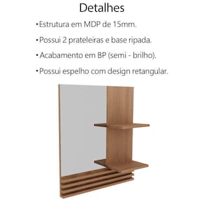 Espelheira Suspensa Para Banheiro BN3614, ideal para inovar o seu banheiro com toque luxuoso e ao mesmo tempo refinado. Estrutura em MDP de 15mm, proporcionando maior durabilidade e resistência a peça, contando com acabamento em BP (semi - brilho). Composta por 2 prateleiras para armazenar itens, base em detalhe ripado e espelho com design retangular. Suportando 3kg cada prateleira. Perfeita para deixar seu ambiente produtivo, proporcionando uma ambientação elegante e moderna. Este móvel chegará na sua casa separado em 1 volume.