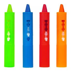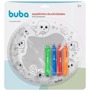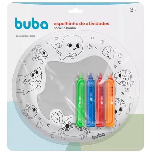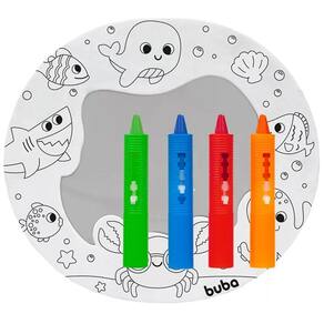 Acompanha 4 gizes de cera que podem ser utilizados durante o banho ou em brincadeiras, permitindo pintar os desenhos em volta do espelhinho ou escrever nos azulejos, podendo ser removidos facilmente com um pano ou esponja.