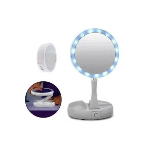 Espelho com luz LED para maquiagem dobrável + ampliação x 10\ nDescriçãoEspelho com luz LED para maquiagem dobrável + ampliação x 10\ nFonte de alimentação: bateria AA (4) ou cabo USB (incluído)\ nEspelho duplo: frontal 1X reverso 10X\ nO espelho pode girar 270°\ Nenhum botão\ nDiâmetro: 15 cm de altura e 5 cm esticar até 30 cm Embalagem: cartão
