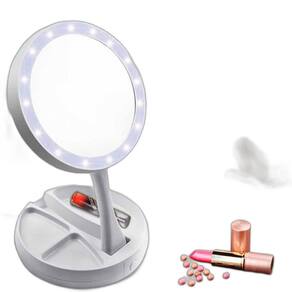 Além de ter um design elegante, este espelho de maquiagem com dupla face é iluminado com LEDs, sendo muito prático. Basta pressionar um botão na parte inferior do suporte para ligar as luzes LED.